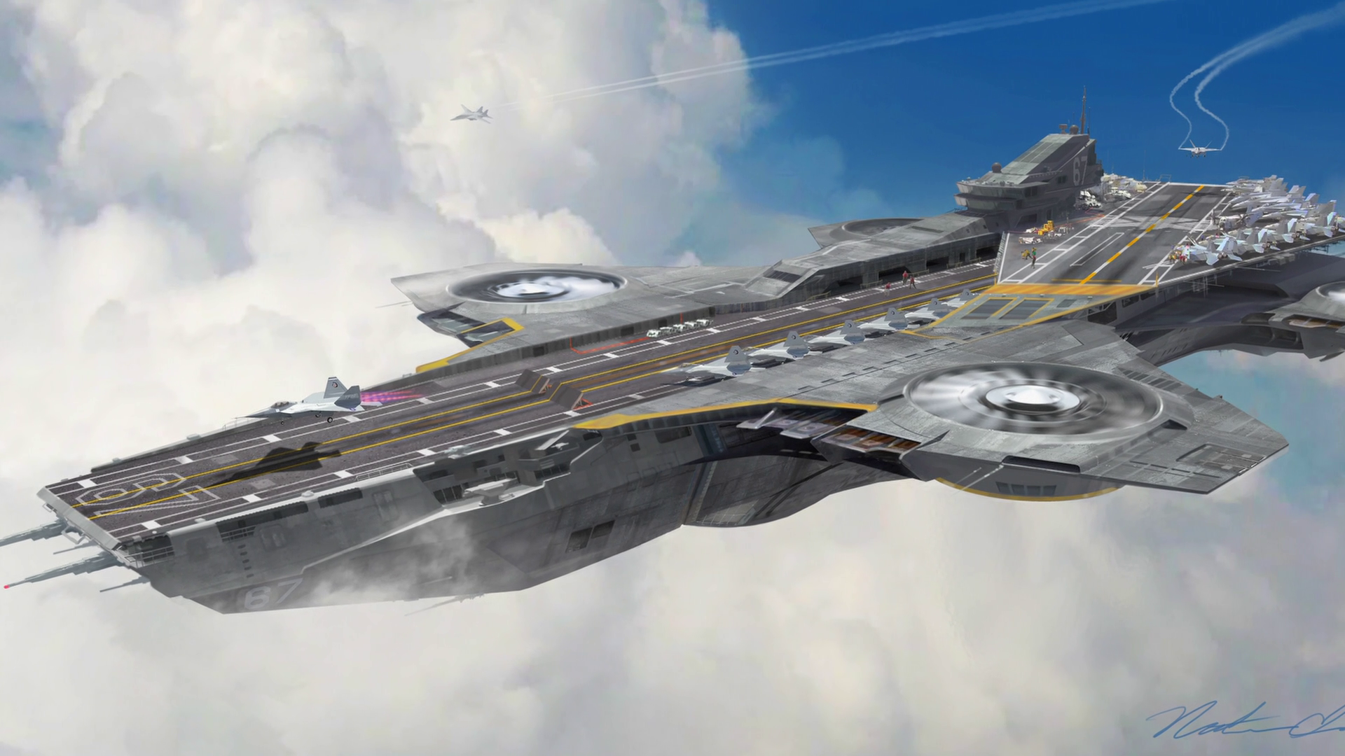 There will be the long road to full-size solutions for that thing, what is in some Marvel movie. There will be no technical limits for creating the 300 meters long flying platform, what can operate with the same aircraft than the normal aircraft carrier. So, in theory, that kind of thing can be done by using nuclear power, but in the real life, the size of this vehicle is so huge, that the real-life solution would be impossible. The politicians might be against that, and the propellers must be stabilized because if they are not in full balance, the bearings would be crushed immediately. This vehicle would be heavier than air, and if there will be the malfunction of the system, that would cause the destruction of this thing.